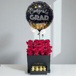 Una caja de regalo audaz y elegante para graduación que incluye 16 rosas rojas de intenso color, 16 decadentes bombones Ferrero Rocher y un globo metalizado festivo con la frase “¡Felicidades, graduado!”. Presentado en una elegante caja negra, este set de celebración combina dulzura, sofisticación y un orgullo sincero—perfecto para honrar su gran logro con estilo.