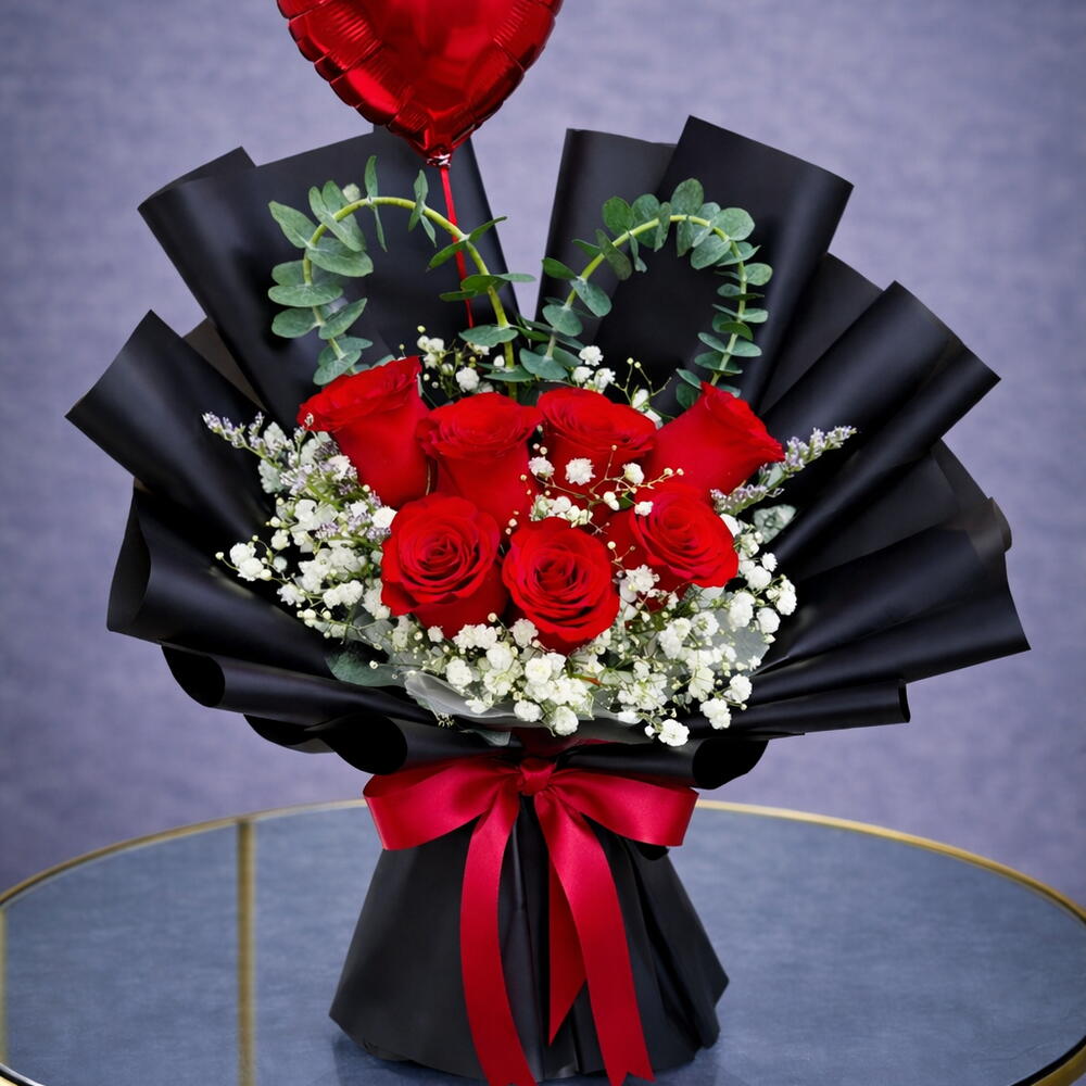 Déjate seducir por los encantos de la naturaleza con los Especiales de Floristas. Este elegante arreglo incluye 7 rosas rojas, que representan el amor y la pasión, bellamente complementadas con 5 delicadas gypsophila, que le aportan un toque de fantasía. Deja que el globo de aluminio en forma de corazón aporte un toque festivo y la cinta de raso le dé un acabado refinado. Una elección impecable para cualquier ocasión romántica.