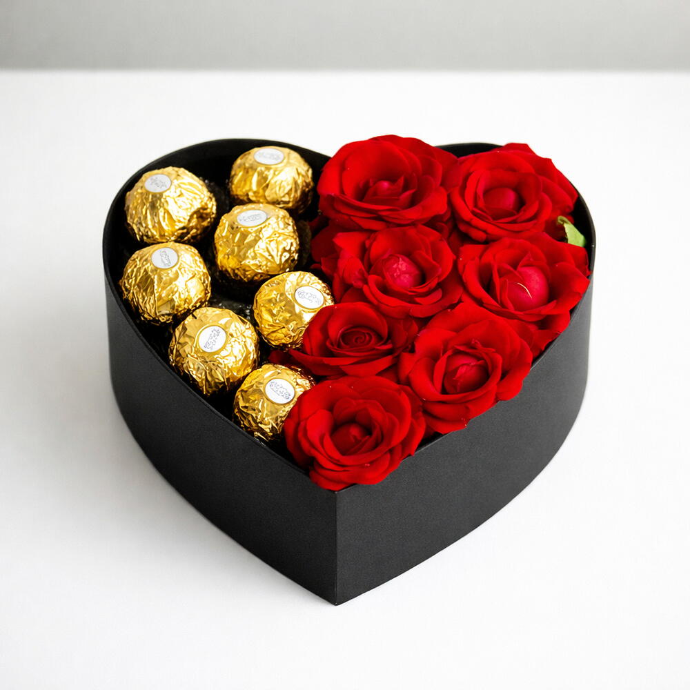 Características destacadas del producto: 🌹 6-8 rosas rojas frescas premium 🍫 10 bombones Ferrero Rocher ❤️ Elegante caja de lujo con forma de corazón 🎁 Romántica combinación de regalo 🚚 Entrega de flores programada el mismo día en Dubái Elige esta caja de 6 rosas rojas y 10 Ferrero Rocher en forma de corazón de Mystic Flowers Dubái si quieres expresar amor, pasión y dulzura de la forma más inolvidable.