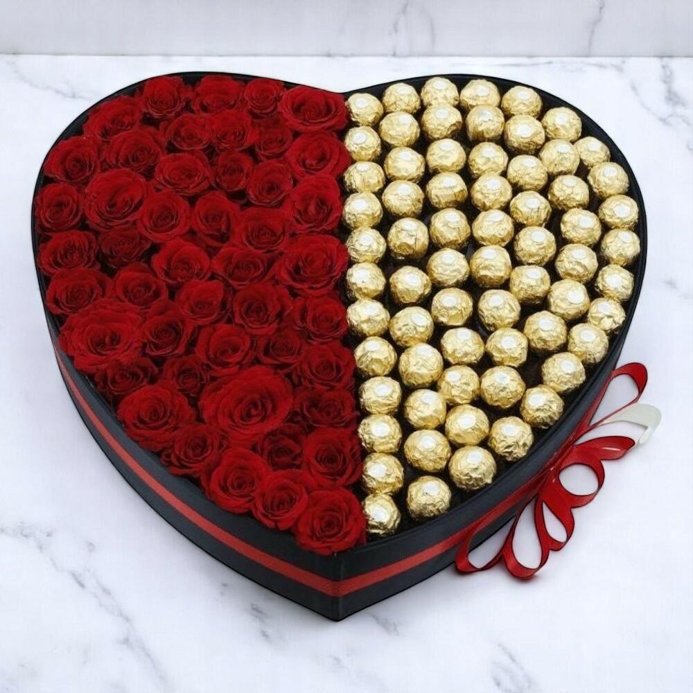 Celebra el lenguaje del amor con nuestras Rosas Rojas y Chocolates Ferrero Rocher en una caja con forma de corazón, el regalo perfecto para expresar un profundo cariño y un dulce placer. Este exquisito arreglo incluye 40 vibrantes rosas rojas en un lado y 40 decadentes chocolates Ferrero Rocher en el otro, bellamente presentado en una elegante caja en forma de corazón adornada con un lazo elegante. Ya sea que celebres el Día de San Valentín, un aniversario de bodas o simplemente quieras mostrarle a alguien cuánto significa para ti, este set de regalo premium llega directamente al corazón. Las vibrantes rosas rojas simbolizan la pasión, mientras que los chocolates Ferrero Rocher envueltos en dorado aportan un toque de lujoso deleite. Instrucciones de cuidado: Coloque el arreglo en un lugar fresco y sombreado. Rocíe ligeramente las rosas con agua para mantenerlas frescas. Guarde los chocolates en un lugar seco y fresco, alejado de la luz solar directa.