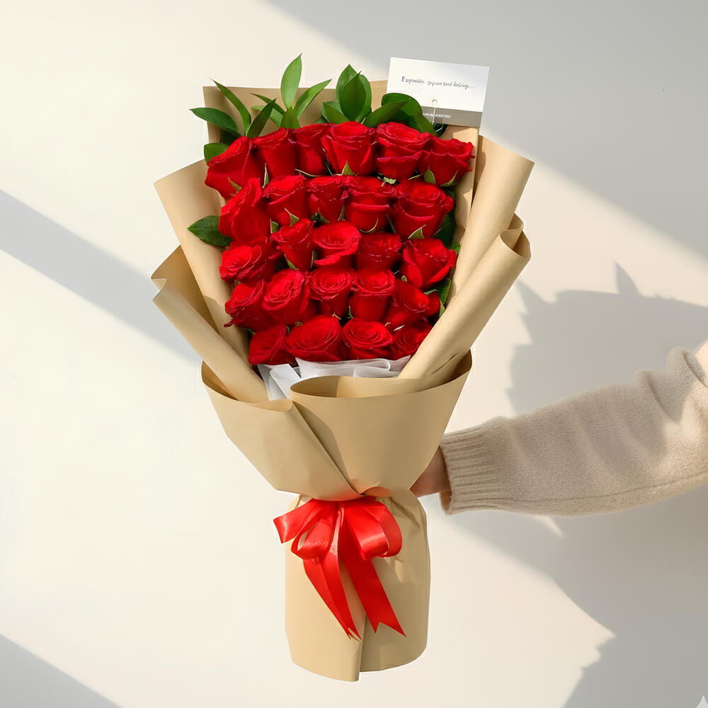 Adornado con follaje fresco y envuelto en elegante papel kraft, este arreglo combina calidez natural con intensidad romántica. Rematado con una vibrante cinta de satén roja, es una elección perfecta para aniversarios, gestos románticos, cumpleaños o celebraciones significativas que requieran belleza clásica y emoción.