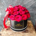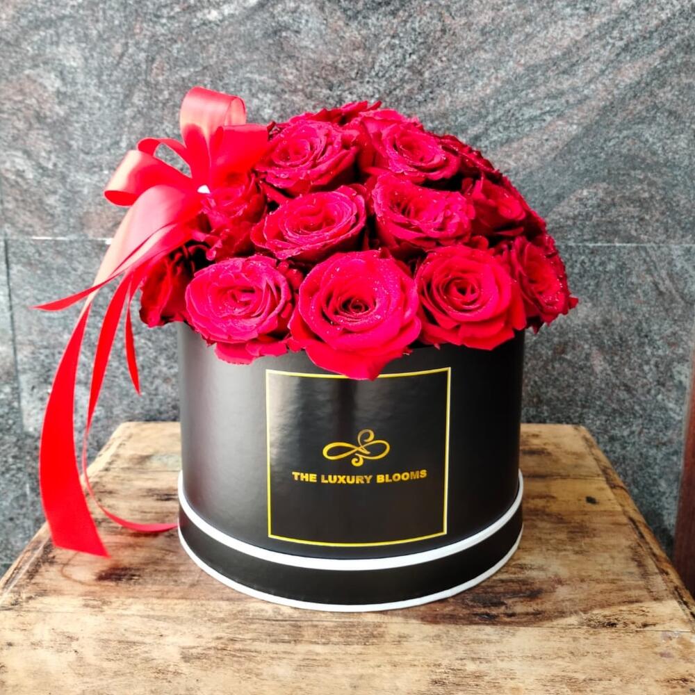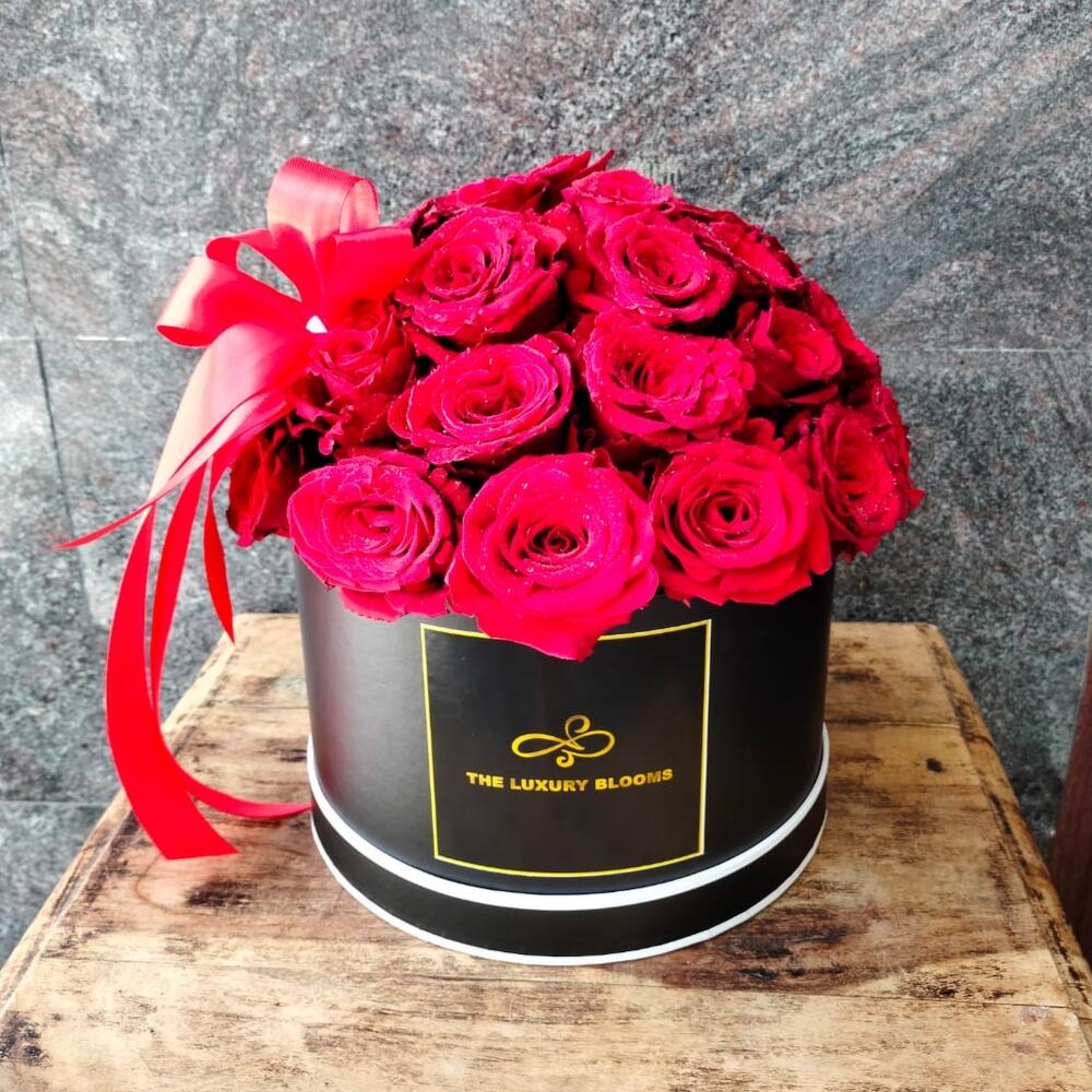 Black round de box - 1 ud. rosa roja fresca - 29 ud. red satin ribbon - 1 ud.
