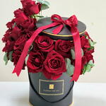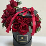 La cinta - 1 ud. flower box - 1 ud. eucalyptus leaves - 3 ud. red roses - 20 ud.