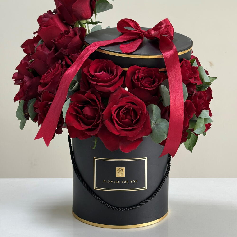La cinta - 1 ud. flower box - 1 ud. eucalyptus leaves - 3 ud. red roses - 20 ud.