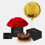 Experimenta la pura elegancia con nuestro paquete de rosas rojas en caja con pastel, que presenta exuberantes flores rojas combinadas perfectamente con un delicioso pastel para una sorpresa verdaderamente romántica.