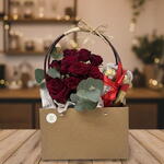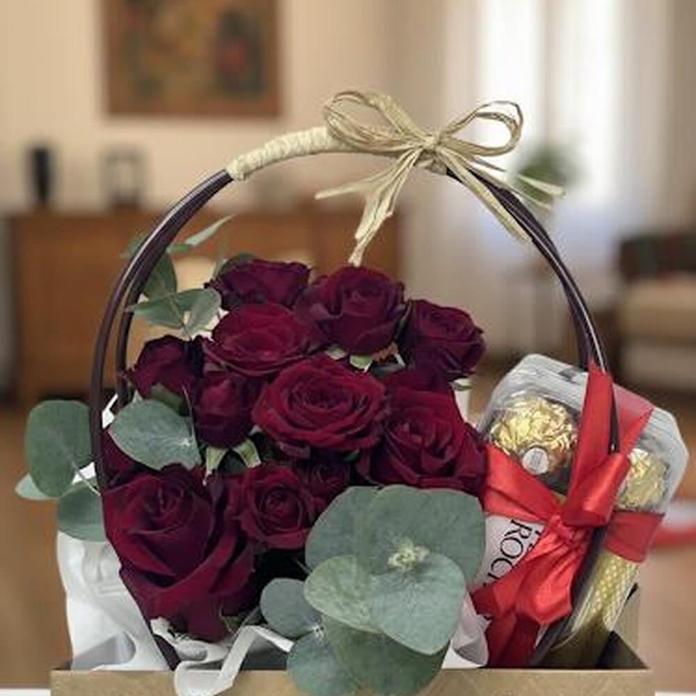 Red rose - 3 ud. Eucalyptus - 2 ud. Ferrero rocher - 16 ud. rosa ramificada roja - 2 ud. bolsa - 1 ud.