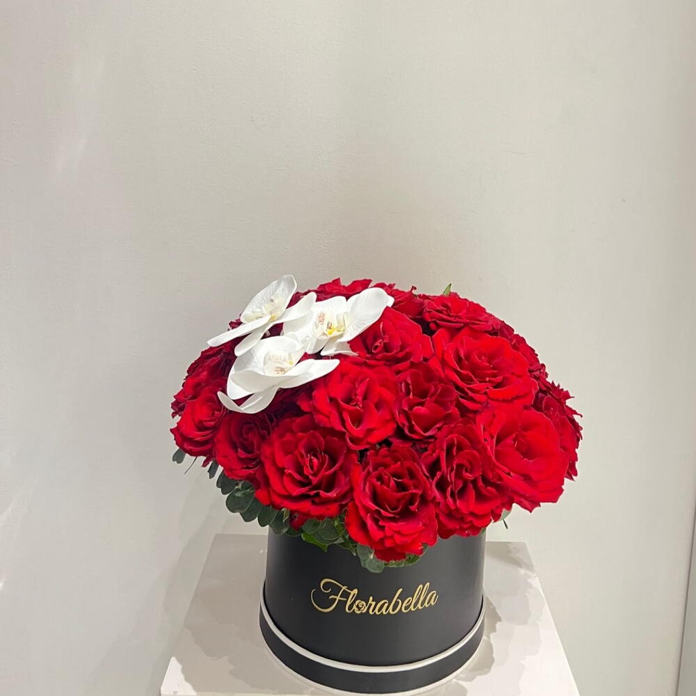 Red rose - 30 ud. phalaenopsis orchid - 3 ud. eucalyptus leaves - 10 ud. caja mediana negra - 1 ud.