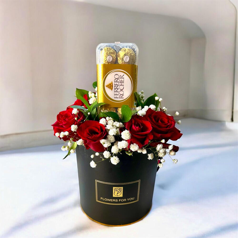 Red rose - 8 ud. Ruscus - 2 ud. Gypsophila - 1 ud. caja redonda - 1 ud. Caja de chocolates Ferrero - 1 ud.