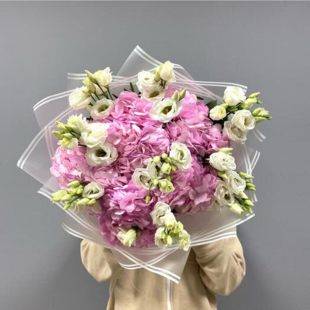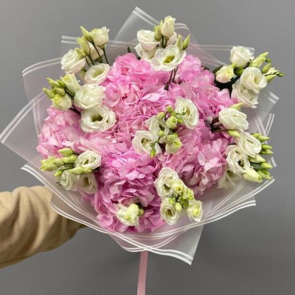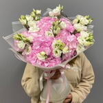 La cinta - 1 ud. Eustoma - 7 ud. Wrapping - 5 ud. hortensia rosa - 5 ud.