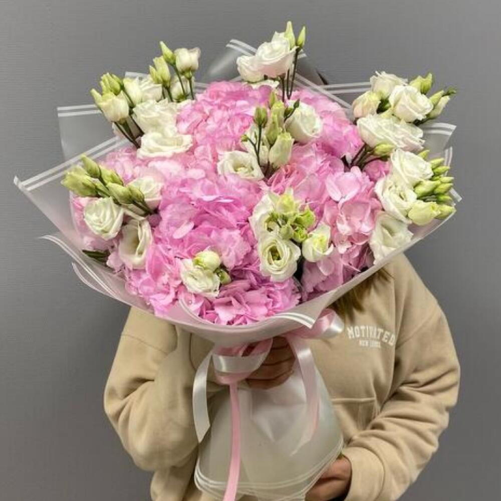 Hortensia rosa con eustoma y cinta de regalo