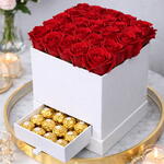 Características destacadas del producto: 🌹 25 rosas rojas frescas premium 🍫 12 bombones Ferrero Rocher en un cajón oculto 🎁 Lujosa caja de regalo cuadrada blanca ❤️ La combinación perfecta de romanticismo y desenfado 🚚 Entrega programada el mismo día en Dubái Elige esta caja de 25 rosas rojas con Ferrero Rocher de Mystic Flowers Dubái si quieres regalar amor, elegancia y dulzura en una presentación inolvidable.