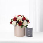 Este arreglo refinado presenta 12 rosas rojas que expresan amor profundo, combinadas con 10 claveles blancos que simbolizan gracia y admiración. Acentuado con 6 rosas spray blancas, 3 limoniums negros y 4 tallos de ruscus, irradia contraste y elegancia. Realzado con un lujoso perfume, Bleu de Chanel — que fusiona belleza, aroma y sofisticación en perfecta armonía.