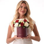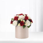 Este arreglo refinado presenta 12 rosas rojas que expresan amor profundo, junto con 10 claveles blancos que simbolizan la gracia y la admiración. Realzado con 6 rosas spray blancas, 3 limoniums negros y 4 tallos de ruscus, desprende contraste y elegancia. Disponible en varios colores de caja — Negro, Blanco, ZUVEES Signature y Arena.