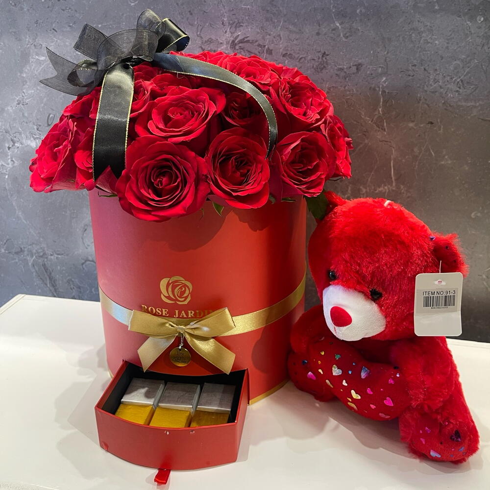 Red rose - 20 ud. Teddy bear - 1 ud. kunafa de chocolate - 6 ud.
