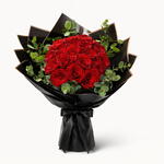 Ramo clásico de 30 rosas rojas con follaje a los lados en un envoltorio negro