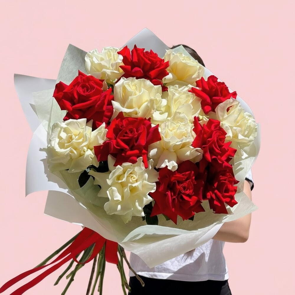 Este llamativo ramo presenta un contraste dramático y equilibrado entre rosas de color carmesí intenso y rosas blancas cremosas. Las grandes flores abiertas están dispuestas con arte para crear una apariencia completa y texturizada que significa tanto pureza como pasión. Cada rosa está en su punto máximo, con pétalos aterciopelados que captan la luz hermosamente contra el suave fondo rosa. El arreglo está envuelto en papel floral blanco translúcido, creando un marco ligero y aireado que realza el brillo natural de las flores. Una vibrante cinta roja ata los tallos, añadiendo un toque final de elegancia clásica.