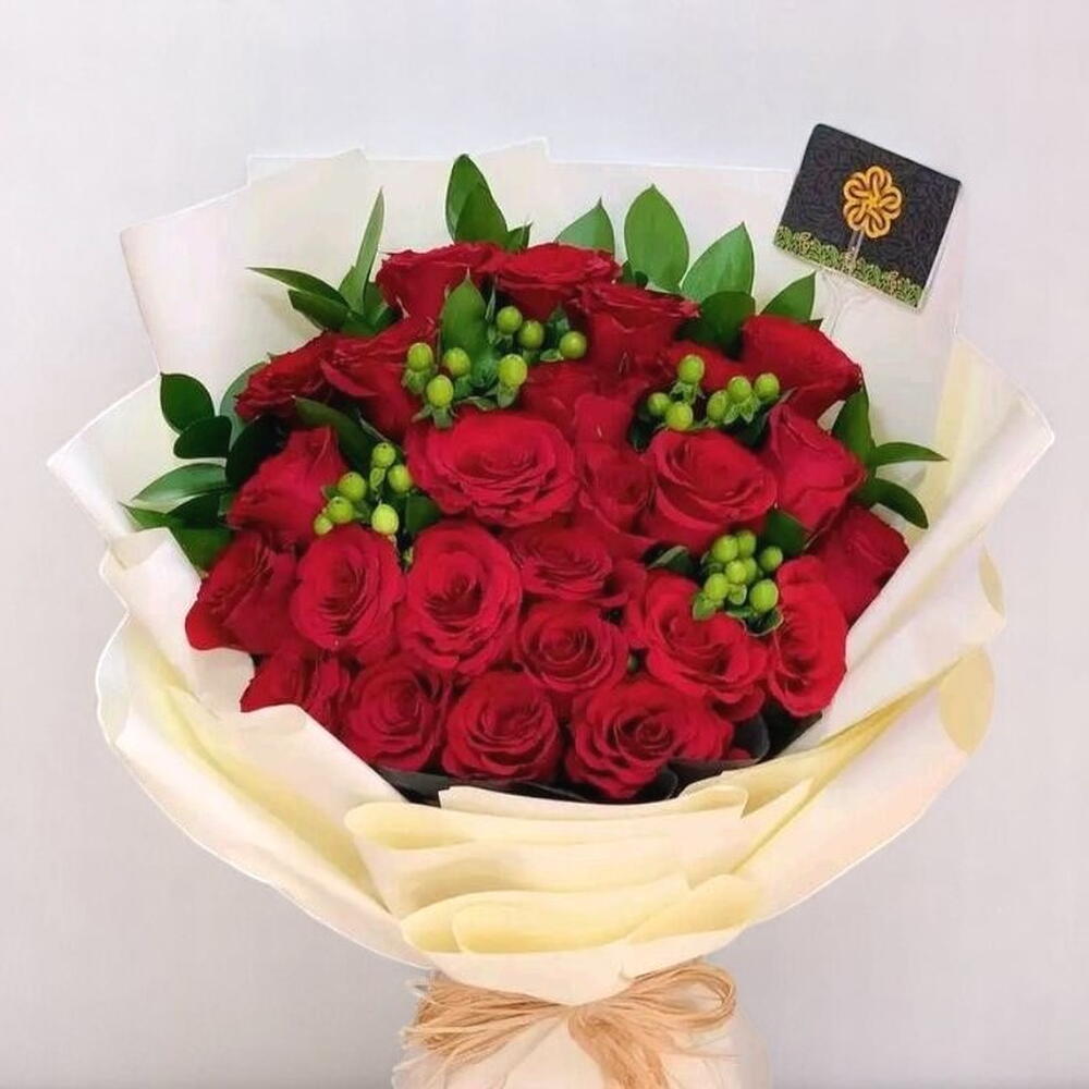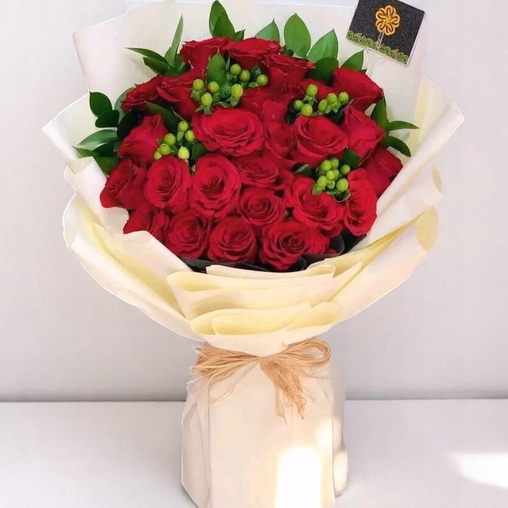 Una encantadora combinación de elegancia y cariño, este ramo de vibrantes rosas rojas y alegres bayas verdes de hipérico es una forma atemporal de expresar tu amor. Acompañado de un osito de peluche rojo que sostiene un corazón que dice «Amor», este set de regalo es ideal para ocasiones románticas, cumpleaños o simplemente para alegrarle el día a alguien. El rico contraste de colores crea un aspecto audaz pero elegante, garantizado para impresionar. Para mantener el ramo fresco por más tiempo, colócalo en agua limpia, recorta los tallos en diagonal cada 2 días y consérvalo en un lugar fresco, alejado de la luz solar directa. Cambia el agua diariamente para prolongar la belleza del ramo.