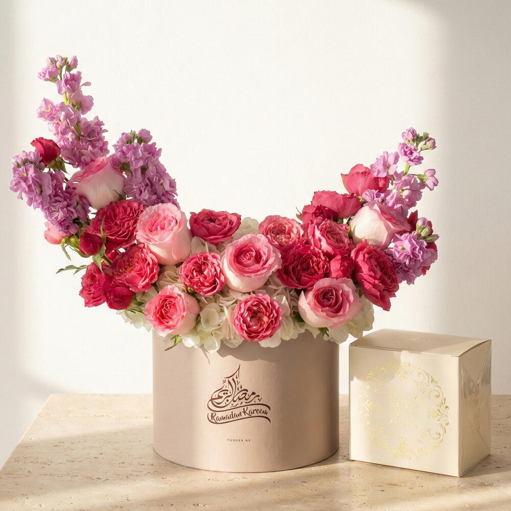 Celebrate the serenity of the holy month with the Rihla in Pink Ramadan Flower Bakhoor Gift Box, a graceful fusion of fresh blooms and traditional Arabian fragrance. Designed in a crescent-inspired silhouette, this elegant Ramadan arrangement features white hydrangea, pink roses, deep pink Julietta roses, and delicate pink matthiola, symbolising renewal, reflection, and spiritual harmony. Presented in a luxurious Ramadan Kareem box and paired with Rasasi Raqiya Bakhoor, this gift fills the home with a warm, soothing aroma that enhances prayer moments, Iftar gatherings, and peaceful evenings. Ideal for Ramadan gifting, home décor, and corporate presents, it offers a refined sensory experience that blends visual beauty with timeless fragrance.