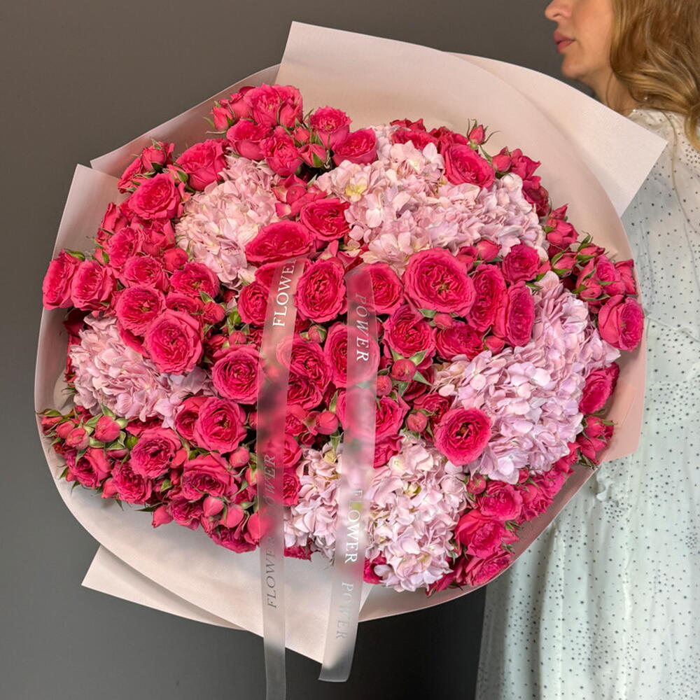 Romance: Ramo de 5 hortensias rosa claro y 30 rosas spray rosa brillante