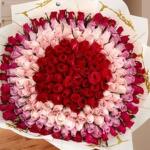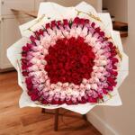 Este gran y colorido ramo presenta un *núcleo radiante de rosas de un rojo intenso* rodeado por capas elegantes de *rosas rosa claro, lavanda y fucsia* dispuestas en un patrón circular perfecto. El degradado de tonos simboliza un viaje de amor — desde la pasión profunda hasta el afecto dulce y la admiración. Es un ramo espectacular, ideal para gestos románticos, bodas o celebraciones impresionantes.