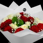 Red rose - 10 ud. Ruscus - 4 ud. White rose - 10 ud. Gypsophila - 3 ud.