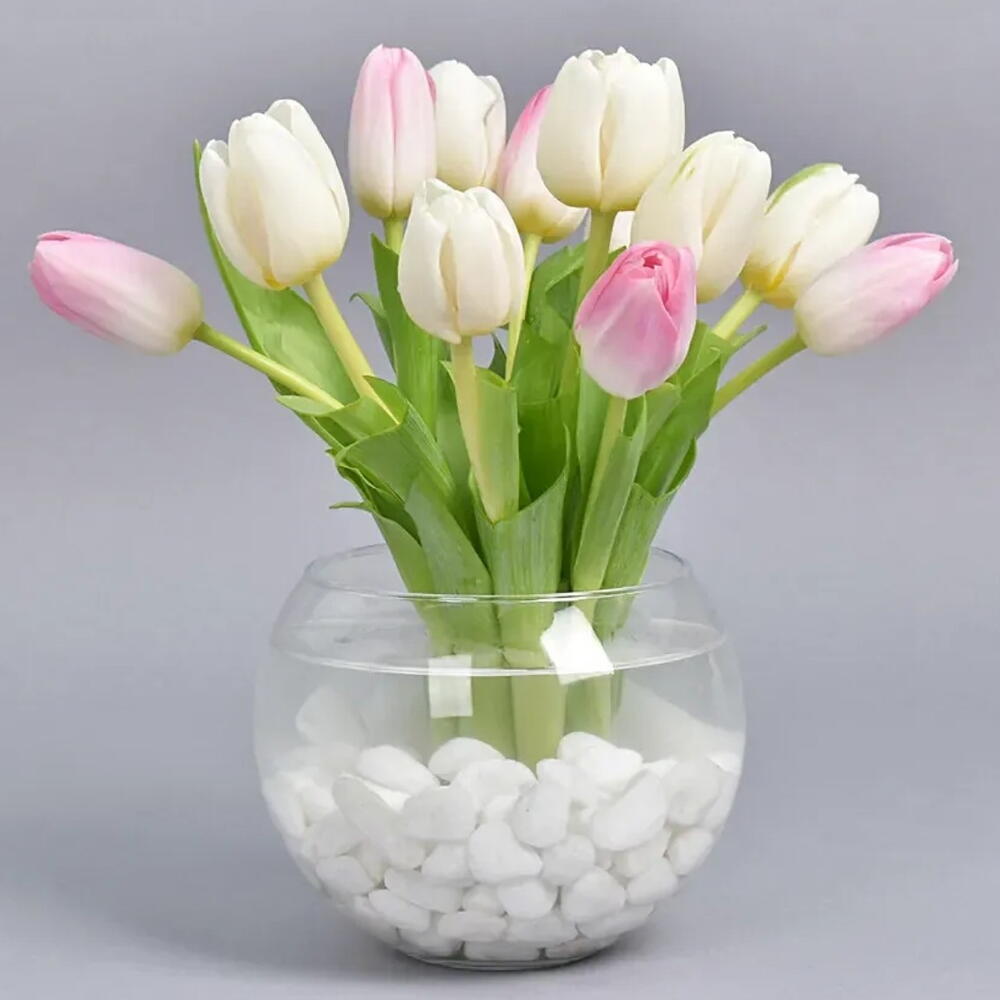 white tulip - 6 ud. piedra blanca - 300 ud. tulipán rosa claro - 6 ud. pecera jarrón vaso - 1 ud.
