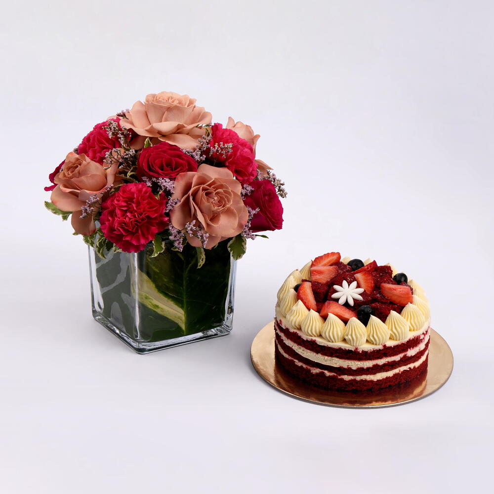 dark pink rose - 4 ud. rosa capuchino - 5 ud. oasis de espuma local - 1 ud. medio kg de pastel red velvet - 1 ud. pittosporum plateado hojas pequeñas relleno - 2 ud. relleno de clavel rosa oscuro - 4 ud. relleno de limonium rosa - 2 ud. relleno de hojas de pothos verdes - 2 ud. jarrón cuadrado de vidrio transparente 12x12cm - 1 ud.