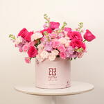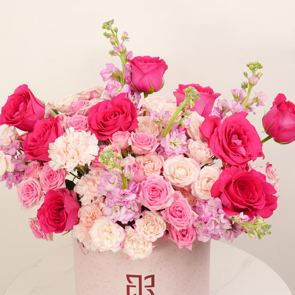 Experimente la elegancia de nuestra colección Flores en Caja con este impecable arreglo. Presentado en una elegante caja redonda rosa, esta delicia floral presume de un vibrante arreglo de flores en atractivos tonos rosados. Con 5 tallos de mathiola rosa que irradian un encanto distintivo, 10 rosas en spray rosa suave para un toque delicado, 10 elegantes rosas rosas y 10 rosas fucsia vibrantes para un contraste impactante. Completamos este conjunto con 10 magníficos claveles rosas, cada pétalo irradia belleza. Garantizamos que añadirán un toque de sofisticación a cualquier espacio; nuestras Flores en Caja son un símbolo de amor, admiración y gracia.