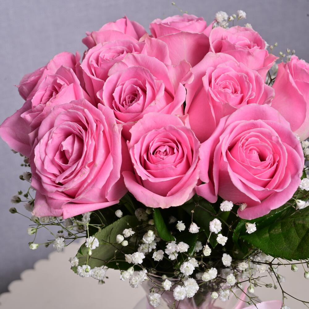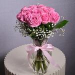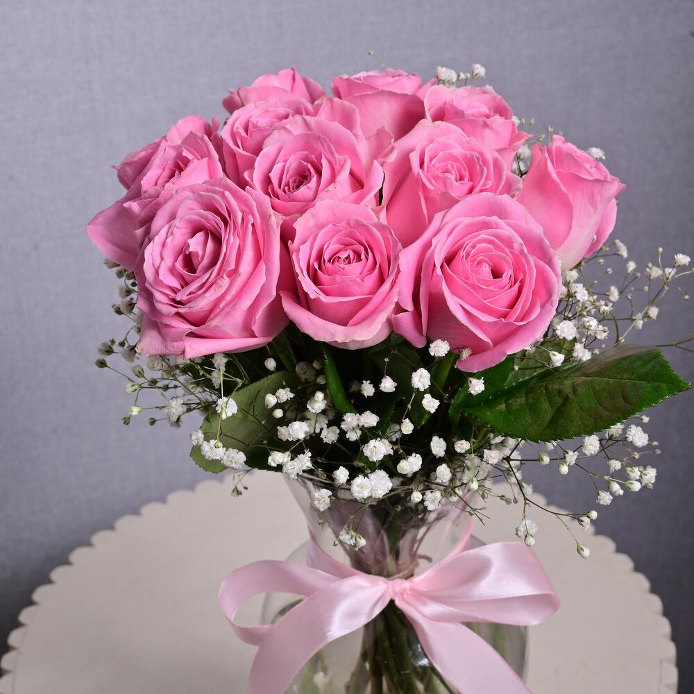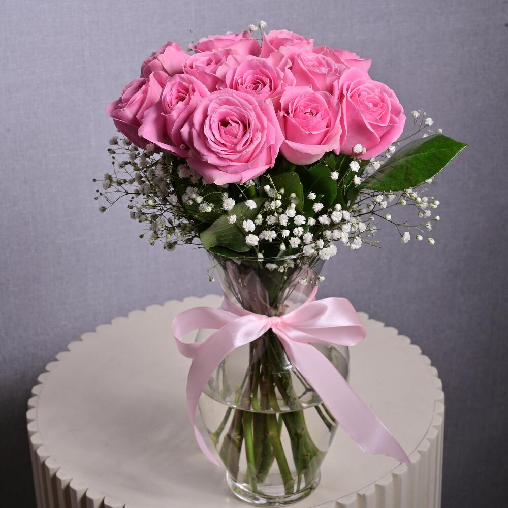 La cinta - 1 ud. jarrón de cristal - 1 ud. tallos de gipsofila - 2 ud. pink roses - 11 ud.