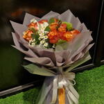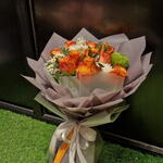 rosa naranja - 11 ud. clavel blanco - 2 ud. spray chrysanthemum - 1 ud. ruscus leaves - 5 ud. helecho de cuero - 5 ud. metchola - 1 ud. alstroemeria blanca - 1 ud. decoración verde - 1 ud.