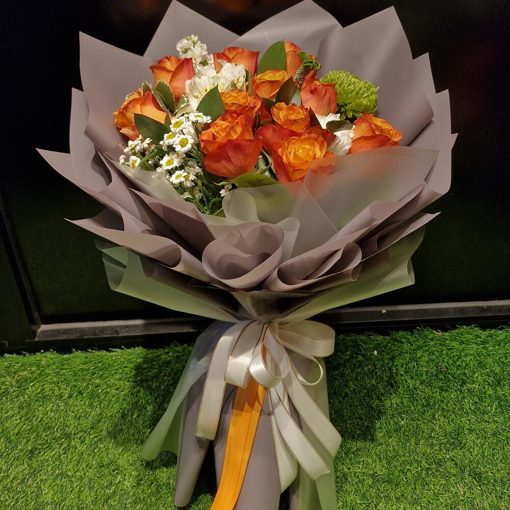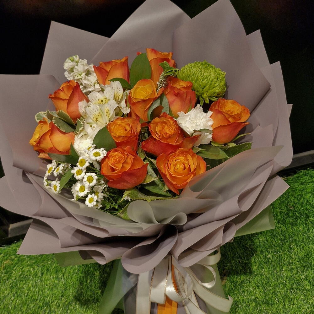 rosa naranja - 11 ud. clavel blanco - 2 ud. spray chrysanthemum - 1 ud. ruscus leaves - 5 ud. helecho de cuero - 5 ud. metchola - 1 ud. alstroemeria blanca - 1 ud. decoración verde - 1 ud.