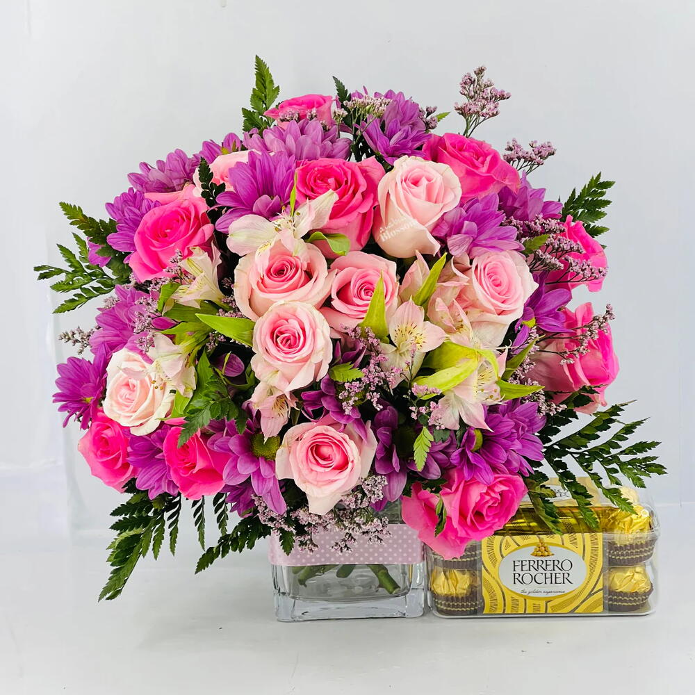 pink alstroemeria - 3 ud. crisantemo morado - 5 ud. jarrón cúbico - 1 ud. pink roses - 16 ud. ferraro rocher 16 pcs - 1 ud.