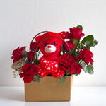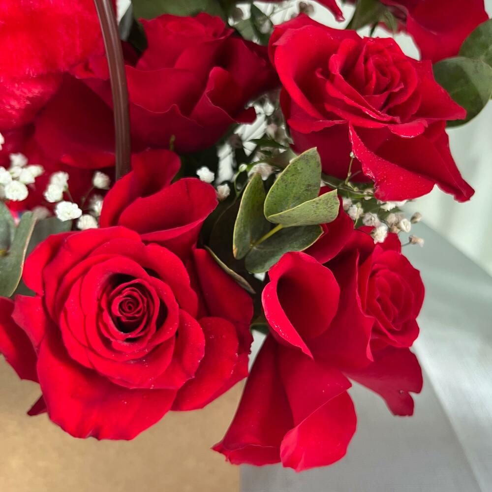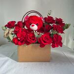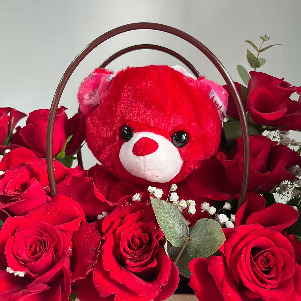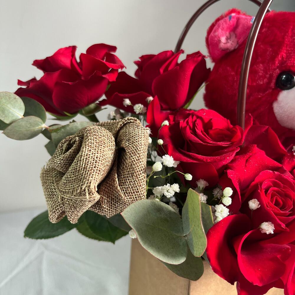 Captura corazones y sonrisas con nuestra Bolsa de Amor Dulce: un encantador arreglo floral con 11 apasionadas rosas rojas y un adorable osito de peluche. Presentada en una elegante bolsa de regalo, esta atenta combinación irradia calidez, amor y cariño. Perfecta para sorpresas románticas, cumpleaños, aniversarios o simplemente para decir "Estoy pensando en ti", este encantador regalo dice mucho sin necesidad de palabras. Las vibrantes rosas rojas expresan una profunda emoción, mientras que el suave osito añade un toque de consuelo y dulzura, convirtiéndolo en un gesto inolvidable. Deja que tu amor se sienta, se vea y se abrace. Incluye: – 11 Rosas Rojas 🌹 – Suave osito de peluche
