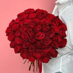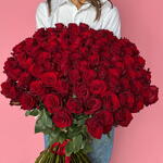 Un gran y opulento ramo de rosas de un rojo intenso, creando un despliegue impresionante de pasión y elegancia. Este lujoso arreglo es la máxima declaración de amor profundo y devoción inquebrantable—un deslumbrante regalo romántico perfecto para aniversarios, declaraciones de amor o cualquier ocasión especial. Tamaño grande - 100 rosas rojas