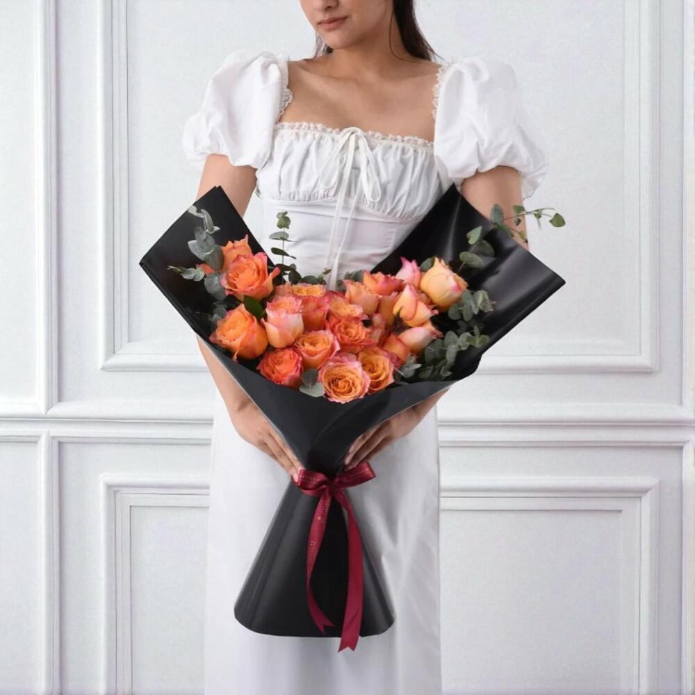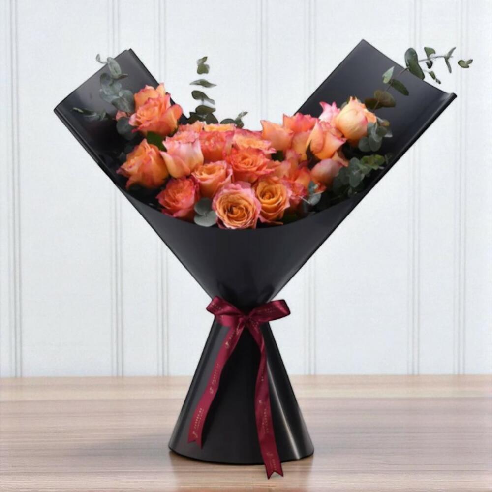 Ramo Royal Sunset – Rosas Free Spirit en envoltorio negro de lujo