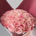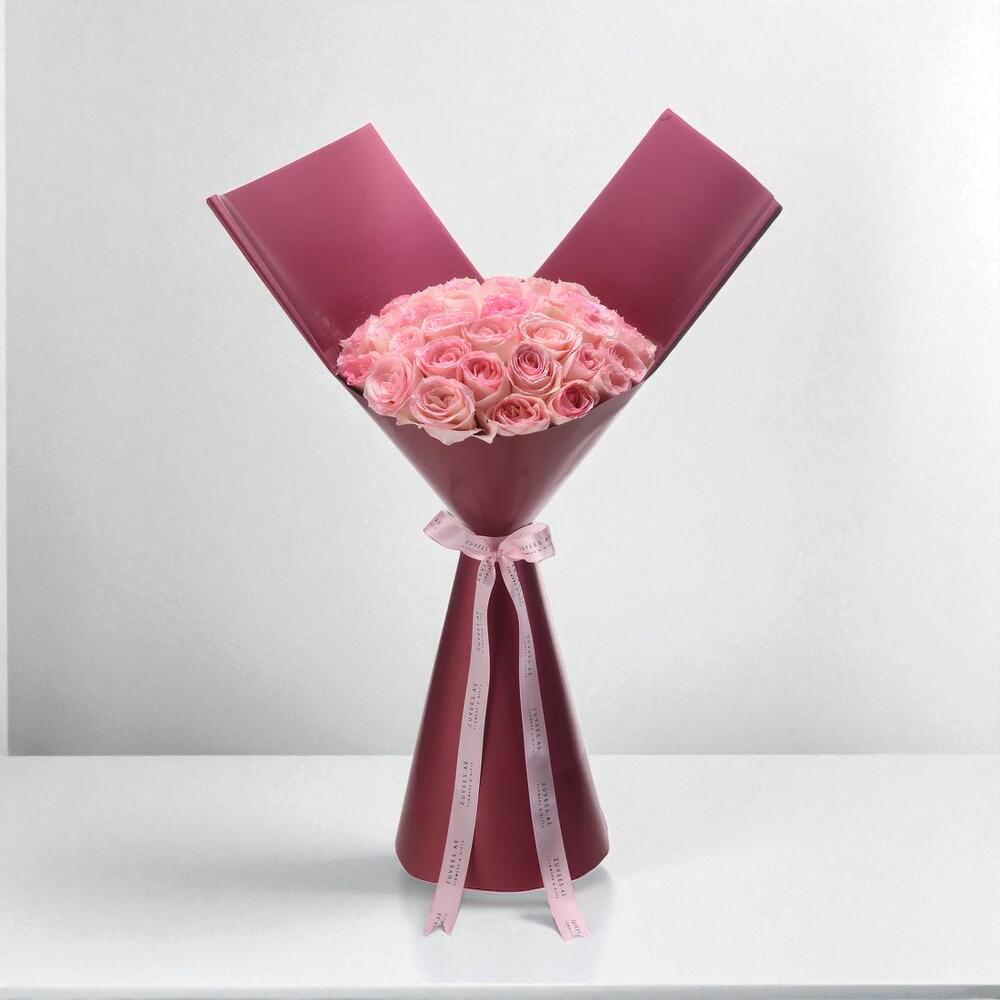 Ramo Royal Thirty de rosas rosadas. 30 rosas rosadas Experance en envoltura granate oscuro – regalo romántico de lujo