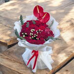Eucalyptus - 3 ud. rose red - 20 ud. anturio rojo - 2 ud. hortensia roja - 1 ud. hipérico blanco - 5 ud. clavel maru - 15 ud.