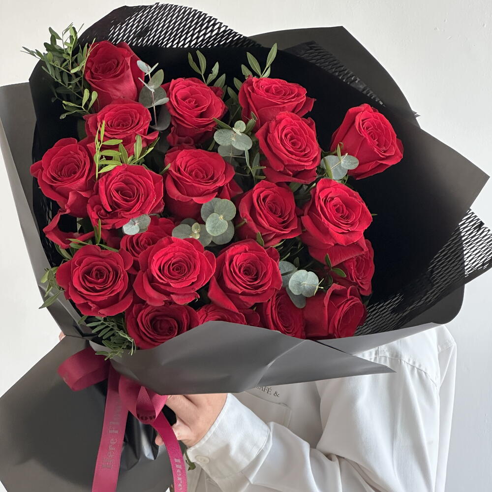 Un ramo llamativo que combina la audaz elegancia con la belleza natural, este arreglo presenta vibrantes rosas rojas, que simbolizan el amor profundo y la pasión. Las ricas flores aterciopeladas se complementan con el exuberante verdor del pistacia y el toque refrescante y aromático del eucalipto, añadiendo capas de textura y fragancia. Envuelto en una elegante cubierta negra, este ramo desprende sofisticación y encanto moderno, convirtiéndolo en una pieza impresionante para cualquier ocasión. La cubierta oscura contrasta hermosamente con los tonos rojos vivos de las flores, creando un aspecto dramático y llamativo que es a la vez atemporal y contemporáneo.