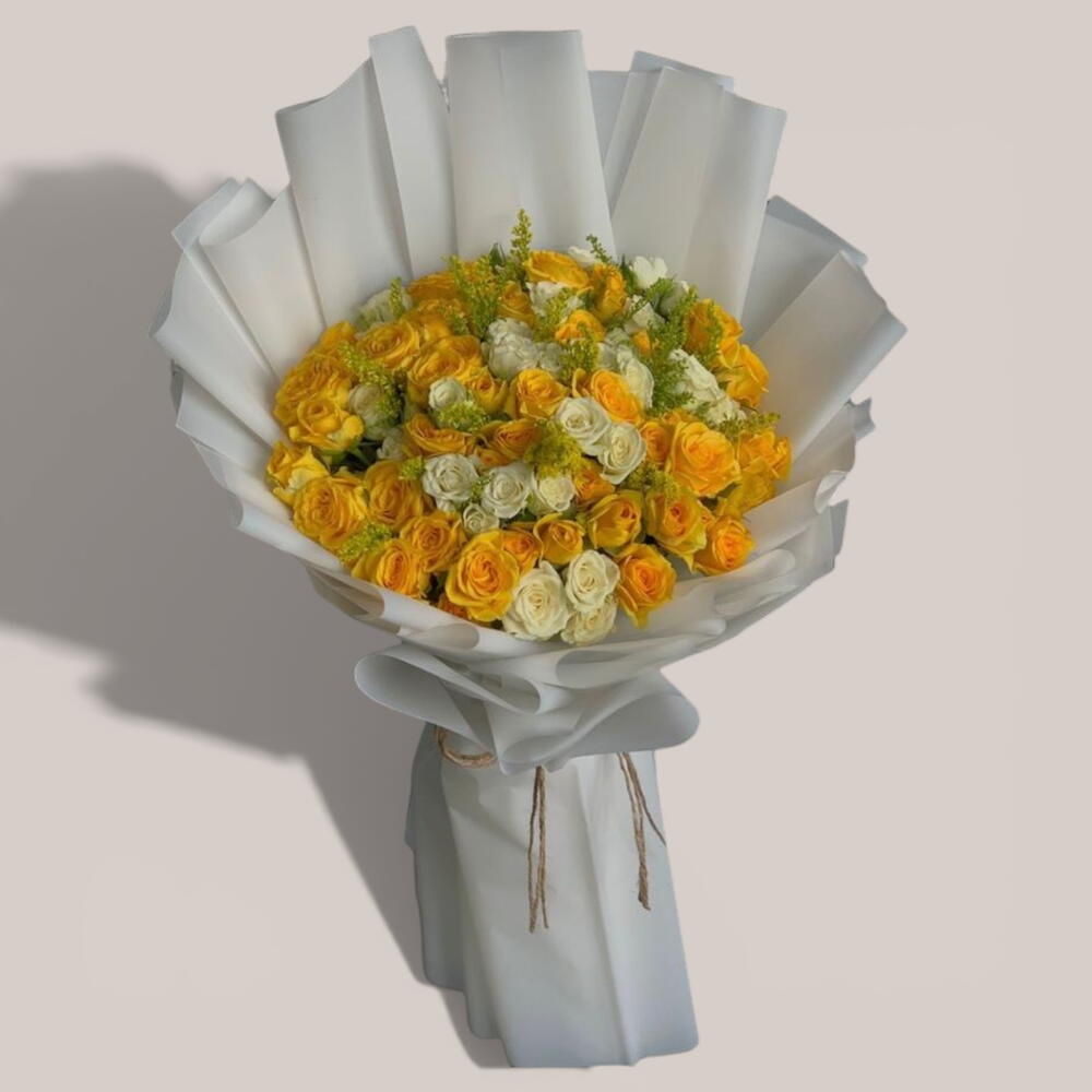 Este vibrante arreglo presenta una alegre mezcla de rosas spray en amarillo soleado y blanco puro, acomodadas entre ramitas de follaje verde fresco. El ramo se presenta en una envoltura escultórica blanca vanguardista de múltiples capas que crea una silueta dramática en abanico, elegantemente rematada con un lazo de cordel rústico. Es una pieza llamativa, luminosa y moderna diseñada para aportar un toque de calidez radiante a cualquier ambiente.