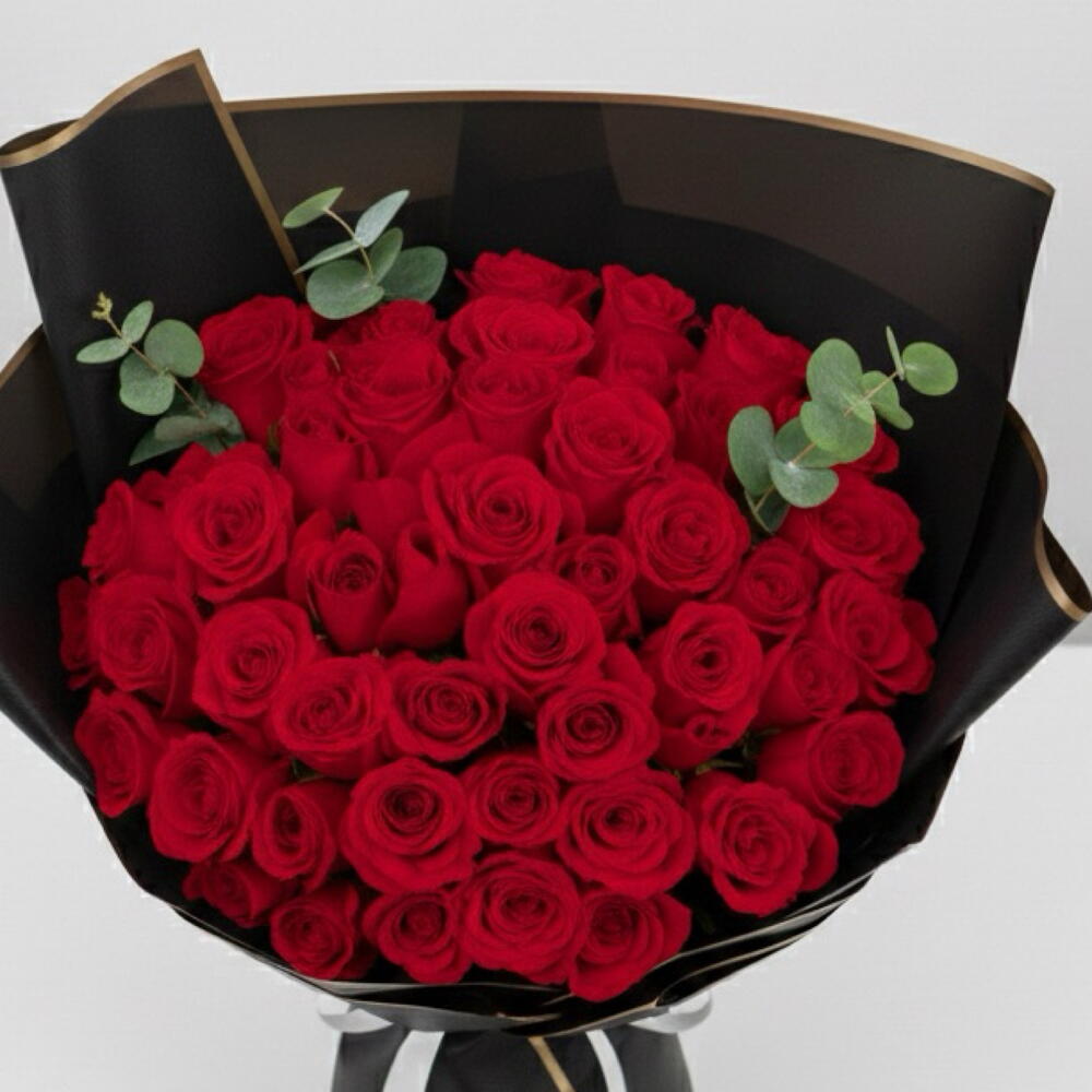 San Valentín – 49 Rosas Rojas Audaz, romántico e innegablemente atemporal: San Valentín es un impactante ramo de 49 rosas rojas premium, elegantemente envueltas en un clásico envoltorio negro y adornado con hojas frescas de eucalipto. Las rosas de color rojo intenso simbolizan la pasión y la devoción, mientras que el eucalipto aporta un contraste refinado y moderno, con un toque suave y refrescante. Diseñado para expresar con fuerza el amor, este ramo habla directamente del corazón. ✨ Detalles del Ramo • 🌹 49 rosas rojas premium • 🌿 Detalles frescos de eucalipto • 🖤 Elegante envoltorio negro para un acabado de lujo • 💐 Hecho a mano con una estética atrevida y romántica 🎁 Perfecto para • San Valentín • Aniversarios y eventos románticos • Grandes gestos románticos • Confesiones de amor clásicas 💖 Ambiente Apasionado • Lujoso • Clásico • Poderoso