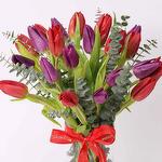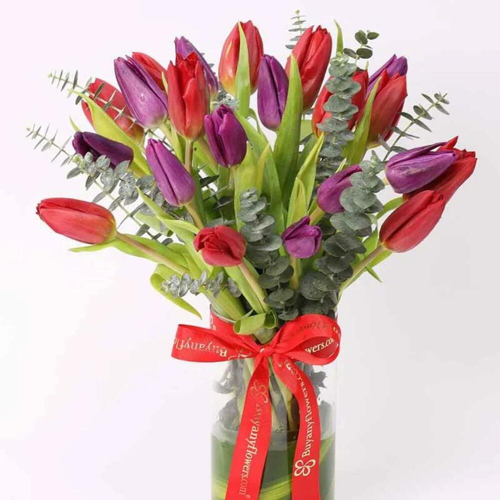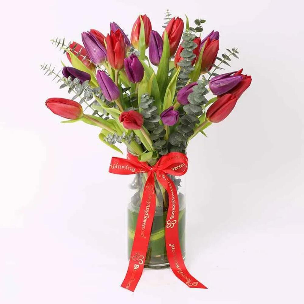 10 Red Tulips 9 Purple Tulips 5 Stems Eucalyptus Leabes Prepared in Glass Vase and a Ribbon Bow