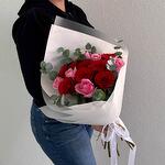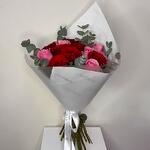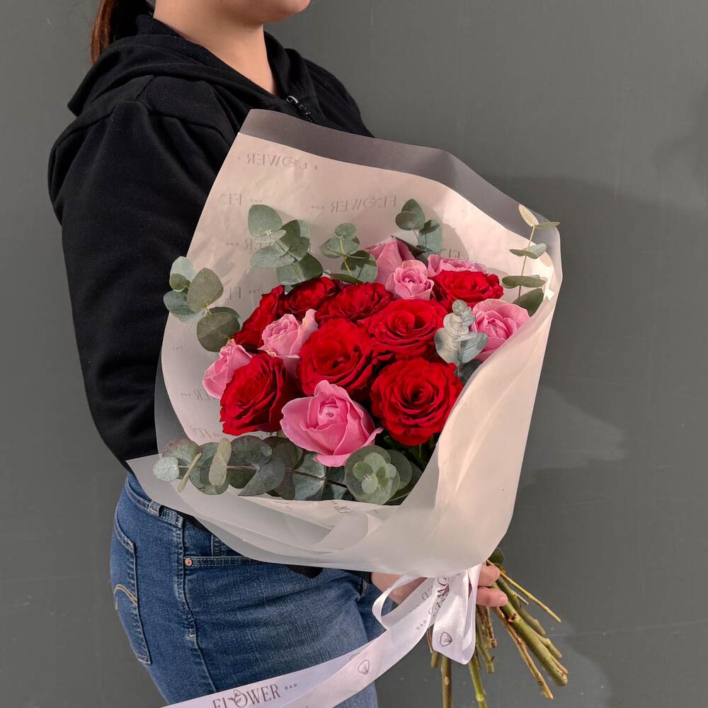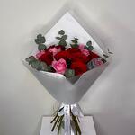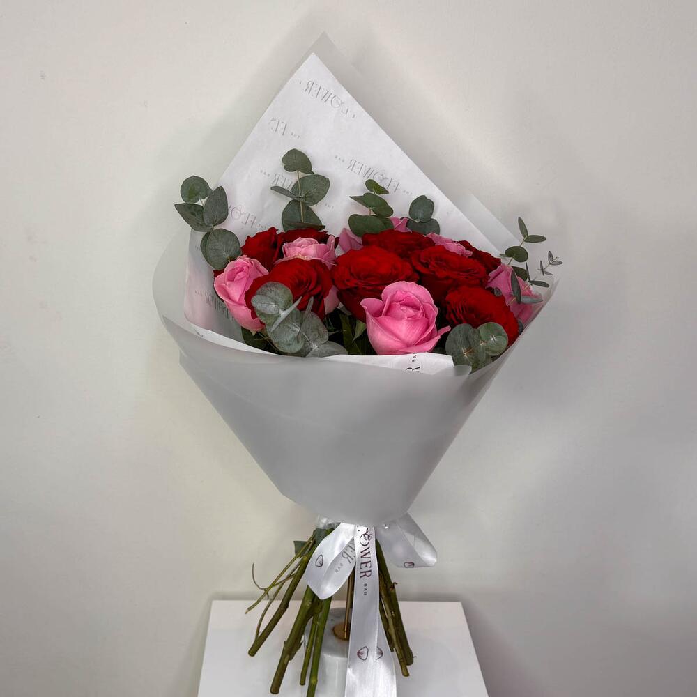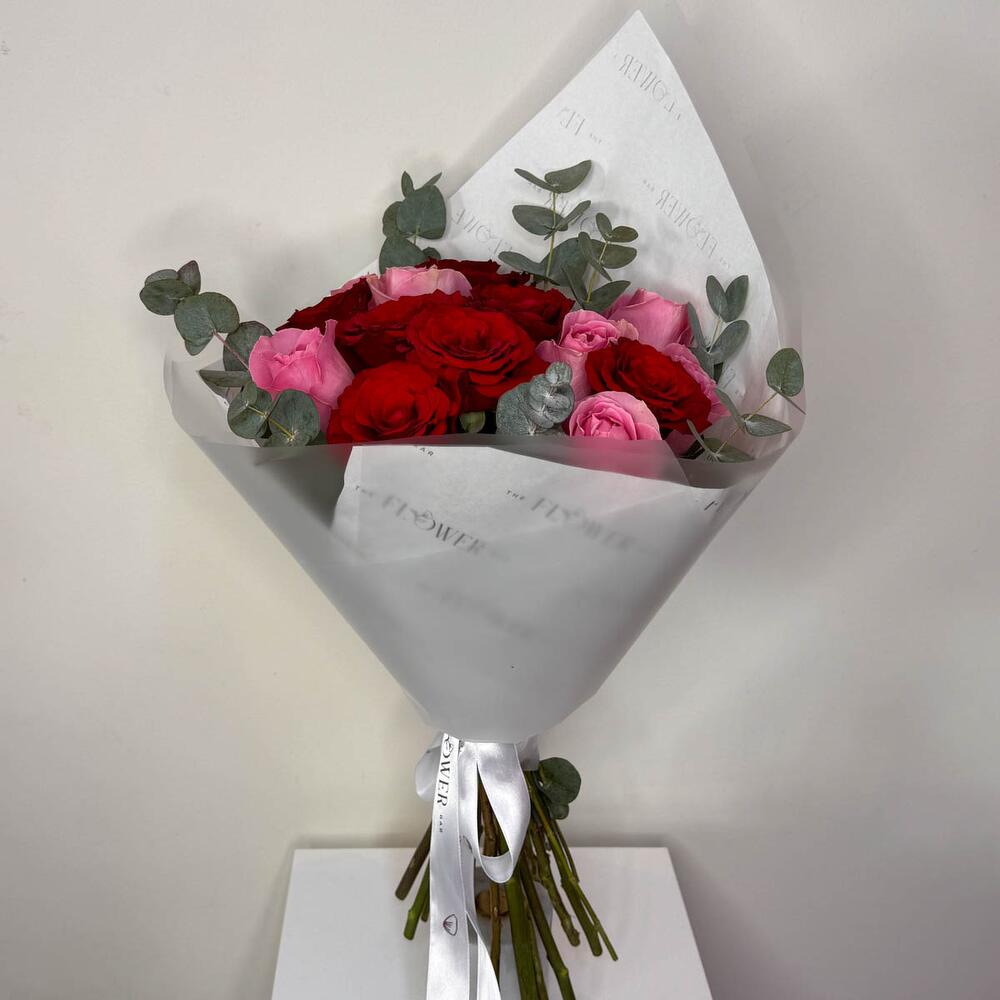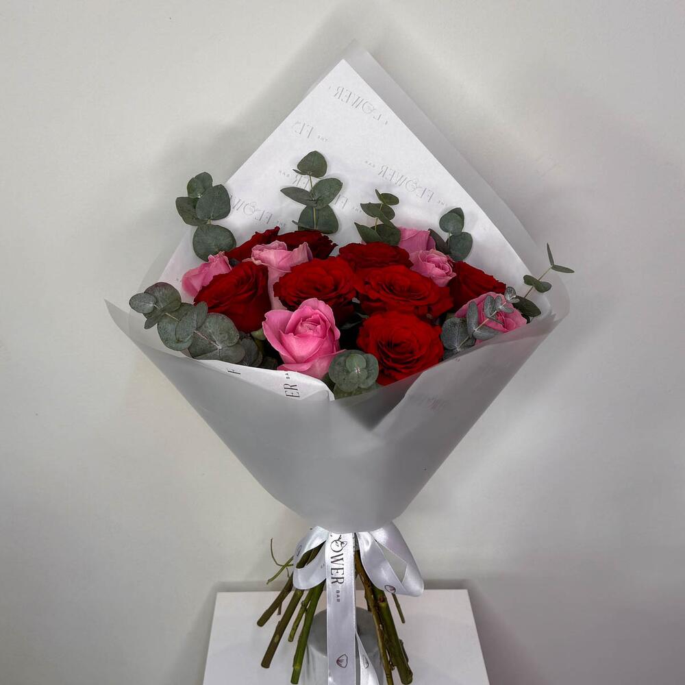 Red rose - 7 ud. Eucalyptus - 1 ud. Wrapping - 1 ud. light pink rose - 8 ud.