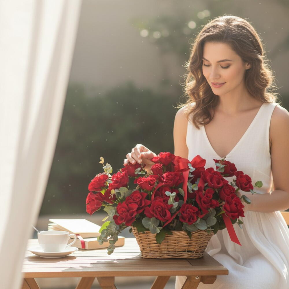 Un impresionante arreglo en cesta de 25 radiantes rosas rojas, que simbolizan el amor, la pasión y el profundo afecto. Acentuado con una elegante cinta, este ramo atemporal hace una declaración audaz y elegante para cualquier ocasión romántica. Mantenga sus flores frescas y vibrantes, cortando los tallos en ángulo, cambiando el agua diariamente y colocándolas en un lugar fresco, alejado de la luz solar directa y de corrientes de aire 30 X 40