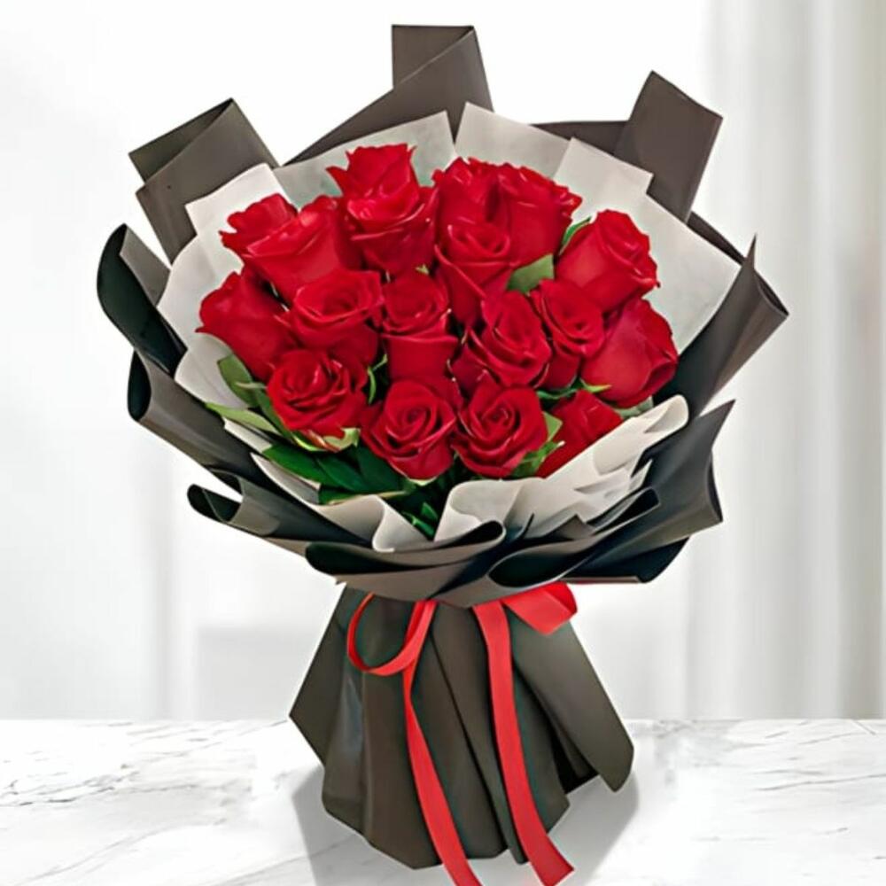 Un ramo impresionante de 18 rosas rojas frescas, bellamente arreglado para expresar amor profundo, pasión y romanticismo. Perfecto para el Día de San Valentín, aniversarios o cualquier ocasión especial cuando las palabras no son suficientes para decir “Te amo.