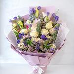 Ramo de 5 tallos de lisianthes morados, 10 tallos de rosas blancas, 3 tallos de lirios blancos, 3 tallos de rosas rosadas y 3 tallos de crisantemos blancos, 3 tallos de statice azul con rellenos en un bonito envoltorio