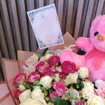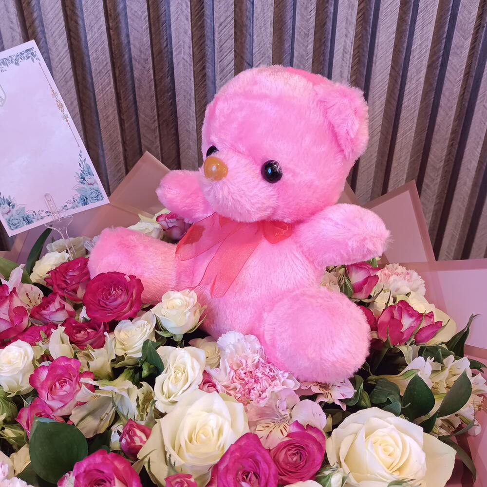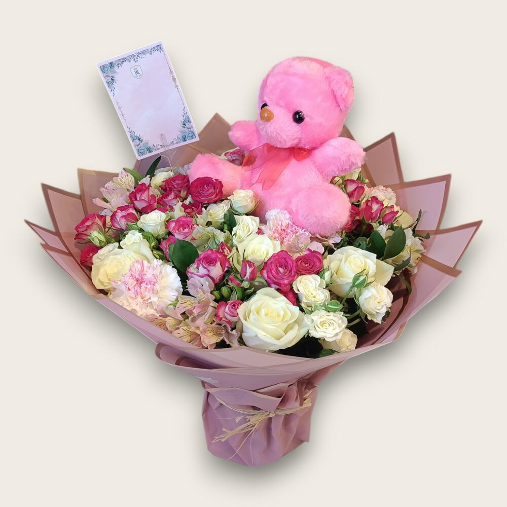 Teddy bear - 1 ud. carnations - 3 ud. tarjeta - 1 ud. roses - 6 ud. spray roses - 10 ud. ruscuss - 6 ud. estomeria - 3 ud.
