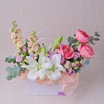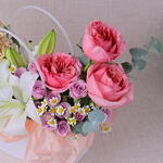 Lily - 2 ud. tanacetum - 3 ud. bolsa de papel blanca - 1 ud. rosas ramificadas moradas - 3 ud. melocotón mathiola blanco - 2 ud. experiencia rosa - 3 ud. eucalipto - 3 ud.