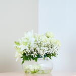 Hydrangea - 1 ud. Lily - 2 ud. Vase - 1 ud. rose - 8 ud. gypso - 5 ud. leatherferm - 5 ud.