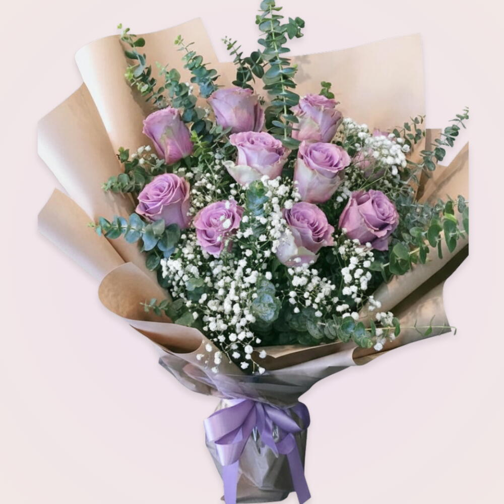 Eucalyptus - 7 ud. Gypsophila - 4 ud. purple rose - 10 ud.