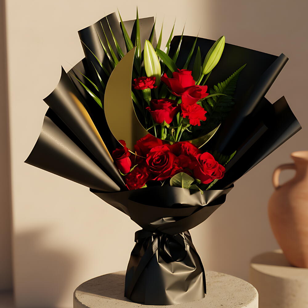Una expresión refinada de gracia y generosidad, Sheikha es un ramo atado a mano inspirado en la elegancia atemporal y la fuerza serena. Las flores de un rojo intenso se disponen en capas con follaje fresco y se rematan con un adorno en forma de luna, creando una composición que se siente a la vez poderosa y serena, perfectamente adecuada para el espíritu del Ramadán.